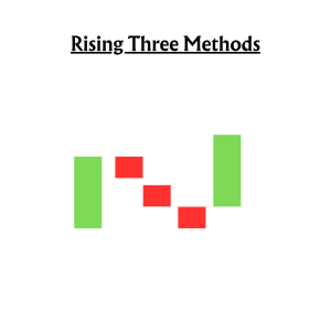 The “ rising three methods ” is a bullish five-bar continuation pattern that signals a break, but not a reversal, in the ongoing uptrend. This candlestick pattern consists of two long candlesticks in the direction of the trend, ie uptrend in this case, at the beginning and the end, and three shorter candlesticks in the middle, counter to the trend.