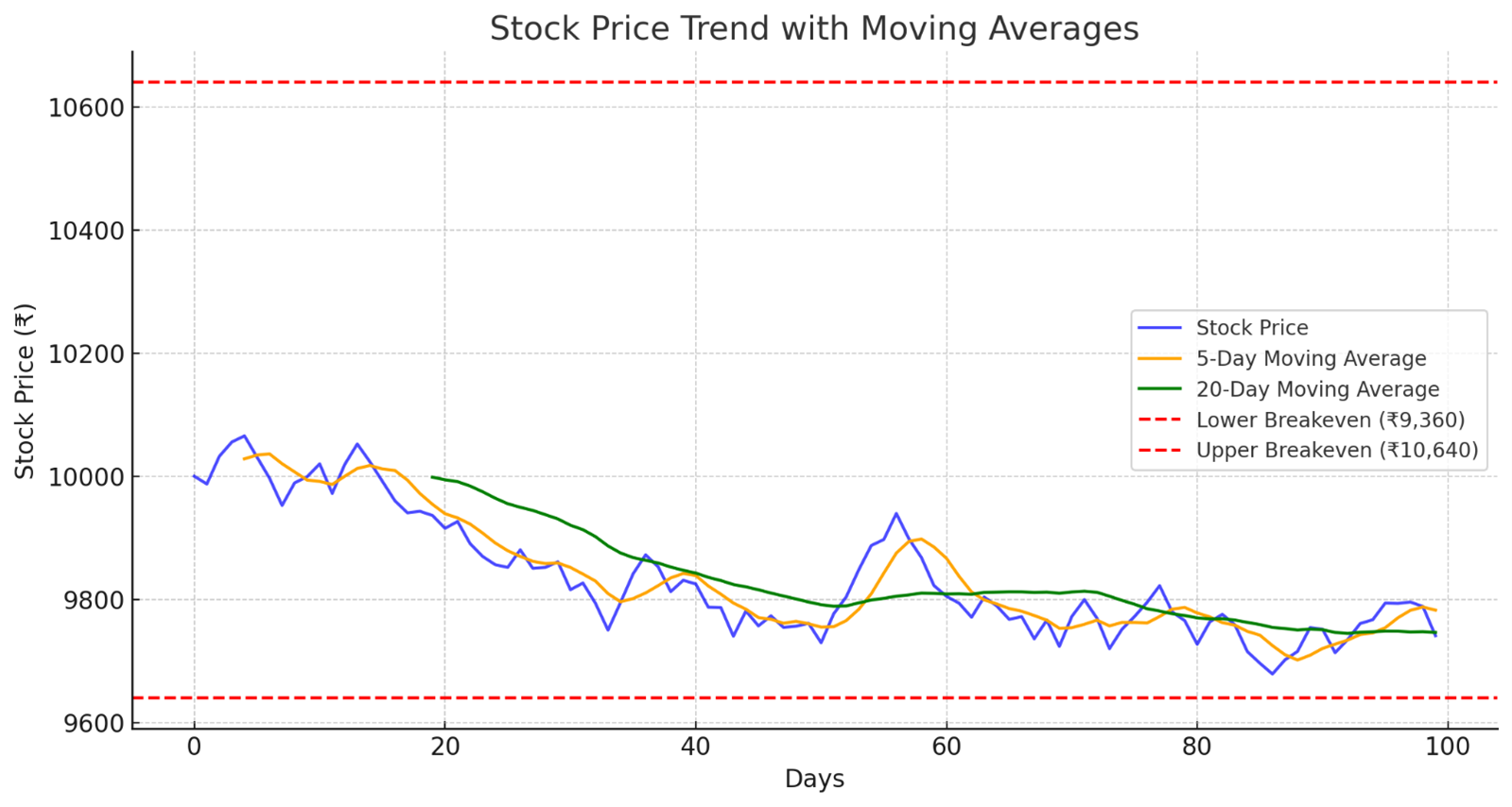 - Break-even Points: The stock price needs to stay between ₹9,360 (₹9,500 – ₹140) and ₹10,640 (₹10,500 + ₹140) for you to break even.