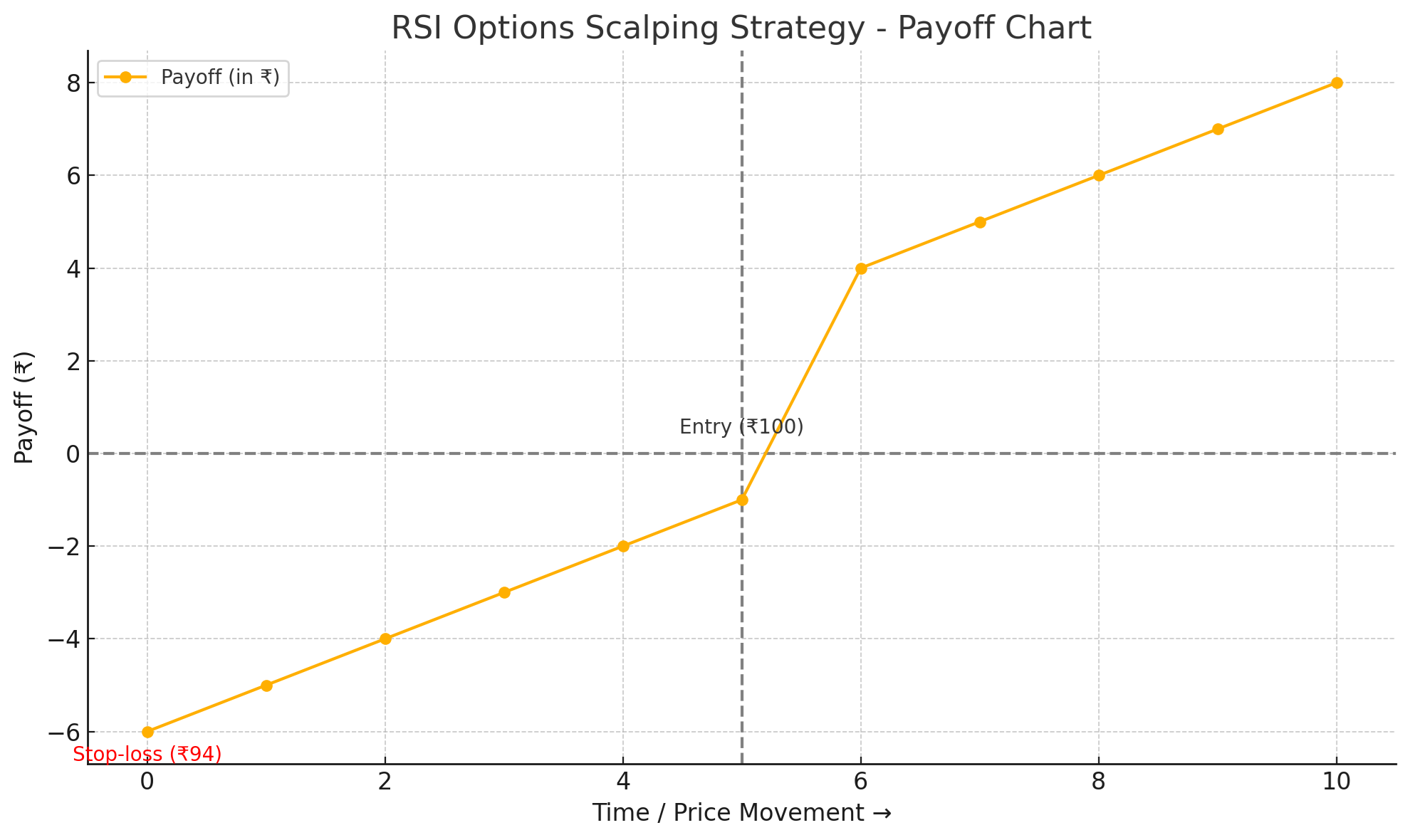 Here’s the payoff chart for the RSI-based options scalping strategy. It visually represents your potential outcomes: a ₹10 profit if the trade moves in your favor quickly, or a ₹6 loss if the setup fails and hits your stop-loss. The x-axis represents price movement over time, while the y-axis shows the payoff in rupees.