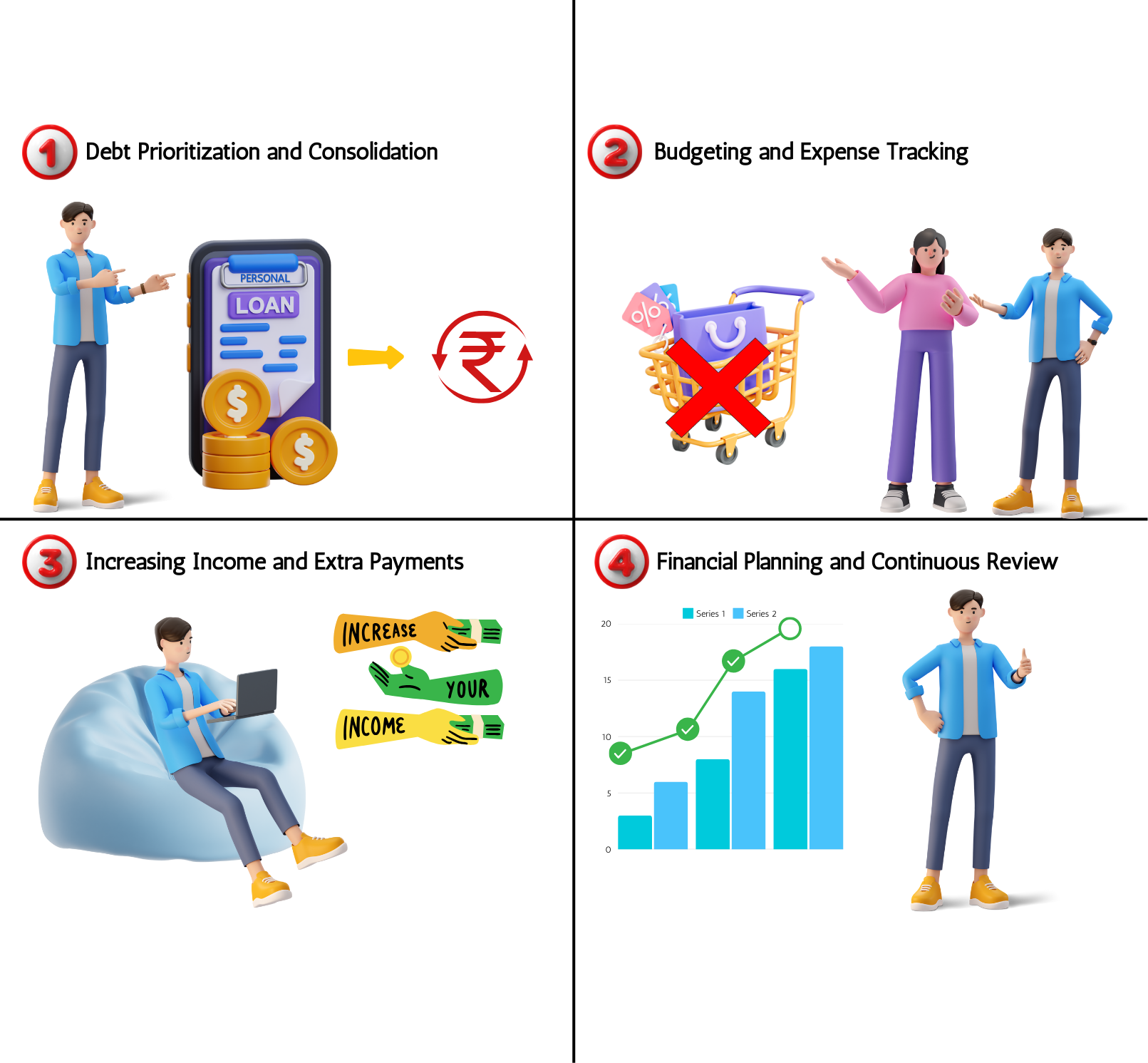 - Budgeting: Creating and sticking to a budget to track income and expenses, ensuring you have enough funds to cover debt payments.