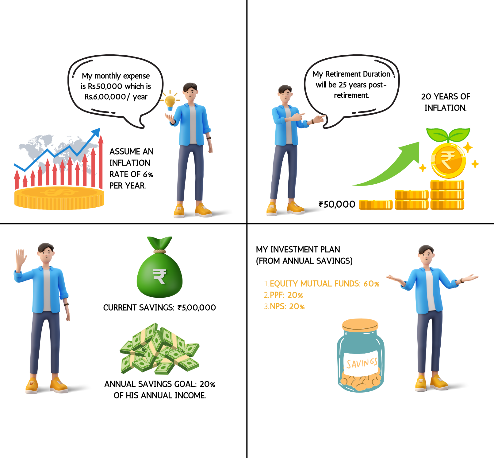 - Monthly Expenses: Assume Ravi will need ₹50,000 per month (adjusted for inflation) during retirement.