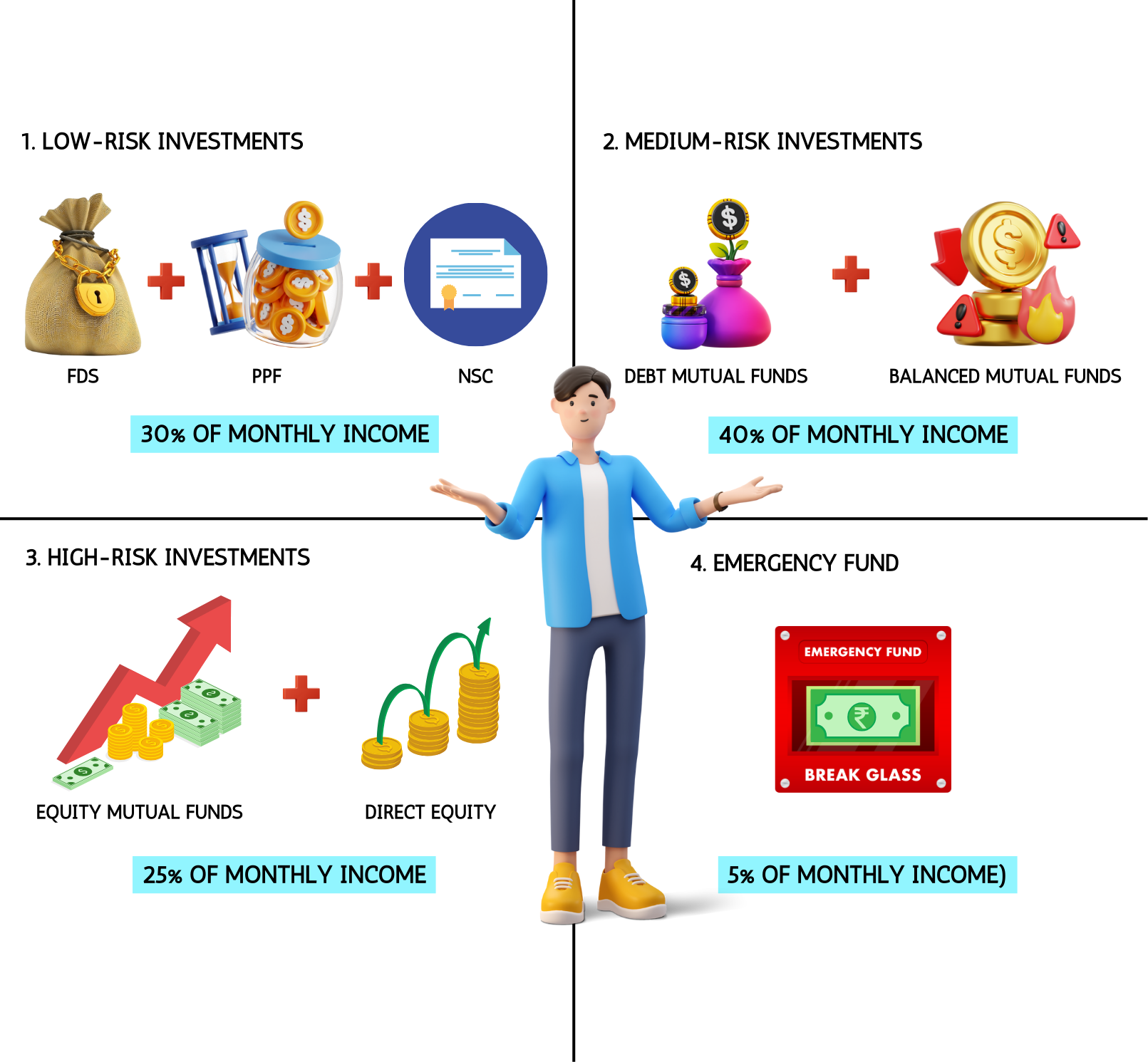 - Equity mutual funds and direct equity investments provide growth potential.
