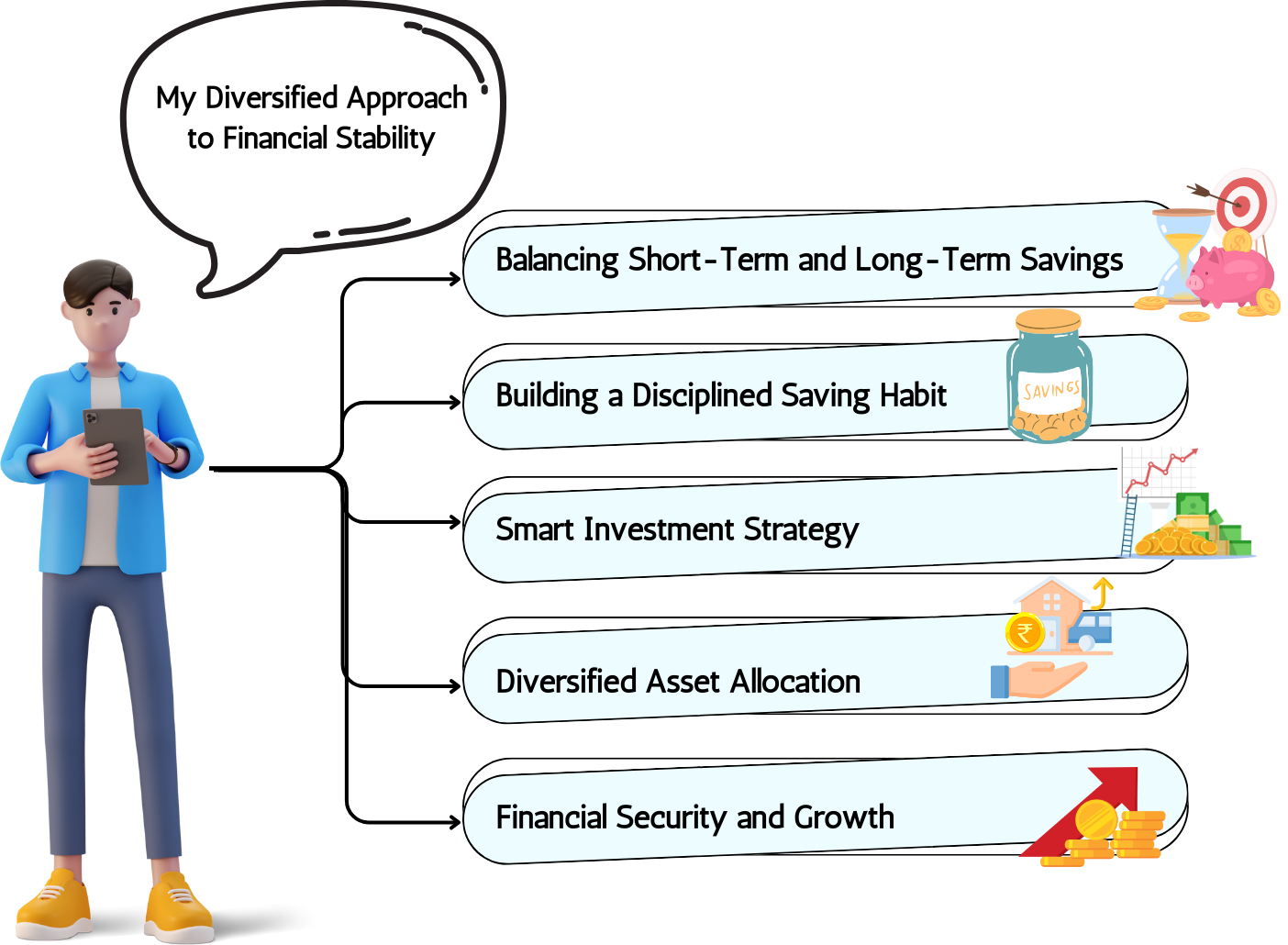 Ravi started by maintaining a savings account for immediate needs and emergencies while investing in fixed deposits for better interest rates. To build a disciplined saving habit, he set up recurring deposits. For long-term growth, Ravi invested in mutual funds through a Systematic Investment Plan. He opened a PPF account for retirement savings and bought National Savings Certificates for tax benefits. Contributing regularly to his EPF, Ravi ensured a substantial retirement corpus. Additionally, he invested in gold and real estate for value appreciation and used digital savings apps for automated savings. Through this diversified approach, Ravi achieved financial stability and worked towards his future goals with confidence.