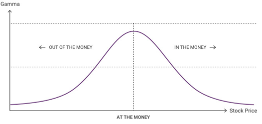 गॅमा ऑप्शनच्या डेल्टा आणि अंतर्निहित ॲसेटच्या किंमतीमध्ये बदल दराचे प्रतिनिधित्व करते. उच्च गॅमा मूल्ये दर्शवितात की अंतर्निहित स्टॉक किंवा फंडमध्ये अगदी लहान किंमतीत बदल झाल्यास डेल्टा नाटकीयरित्या बदलू शकतो.